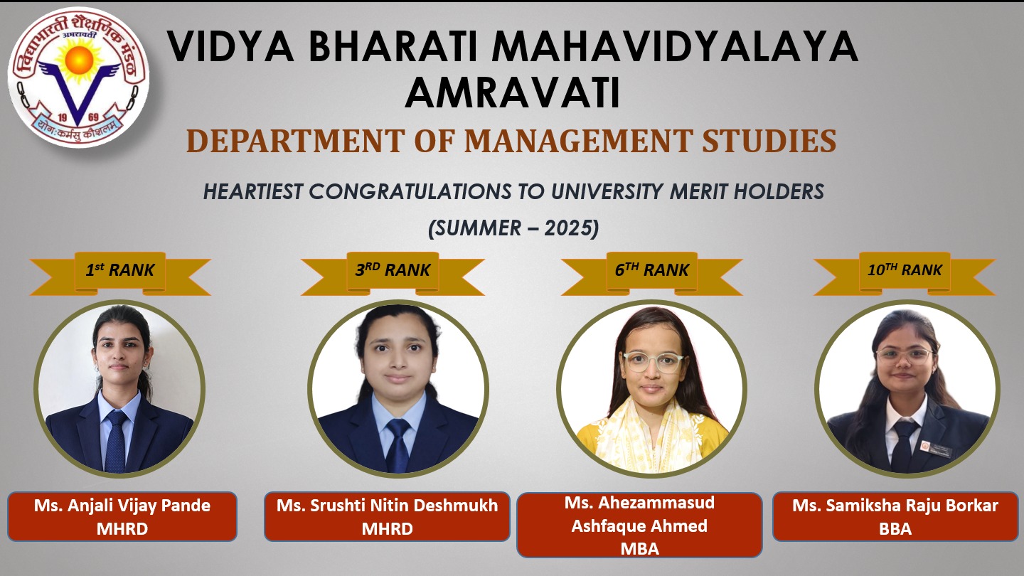 Department of Management Studies is one among the oldest colleges of MBA in the region, under Vidya Bharati Shaikshanik Mandal, Amravati which started with the intake capacity of 30 students grown to intake capacity of 60. Established brand of MBA pulls the students from all over the region and from different segments of the society. The huge multistoried building equipped with physical infrastructure built as per the norms of AICTE, New Delhi is the star attraction. Conducive environment for teaching-learning, best university results, curricular and extracurricular activities, placements are the most attractive features of the department. Above all the creative and innovative human resource is the key to the success of department. The Department of Management offers total of four courses i.e. Three PG courses MBA, MHRD, MCM which were established in the year 1995, 1995 and 2000 respectively while the under graduate course BBA was introduced in the year 2000. The pattern of these courses is Semester wise. To improve upon the student personality and imbibe the socially responsible culture and value, special student forum is created for this and named as AMS (Association of Management Students) and GEMS (General Events & Management Society). Many functions such as celebration of Introduction programme to newly entered students, farewell function to the senior students, arranging of Guest lectures, Seminars, Speeches, Presentation competition, Industrial visits to many organizations, Tours, Teacher’s Day celebration, Workshops on Synopsis Writing etc. are organized by the Management Society. Thus, Management Department keeps in mind the social responsibility of education institute during admission, by satisfying each and every segment of society and focuses towards Output based education by giving students an overall learning experience.